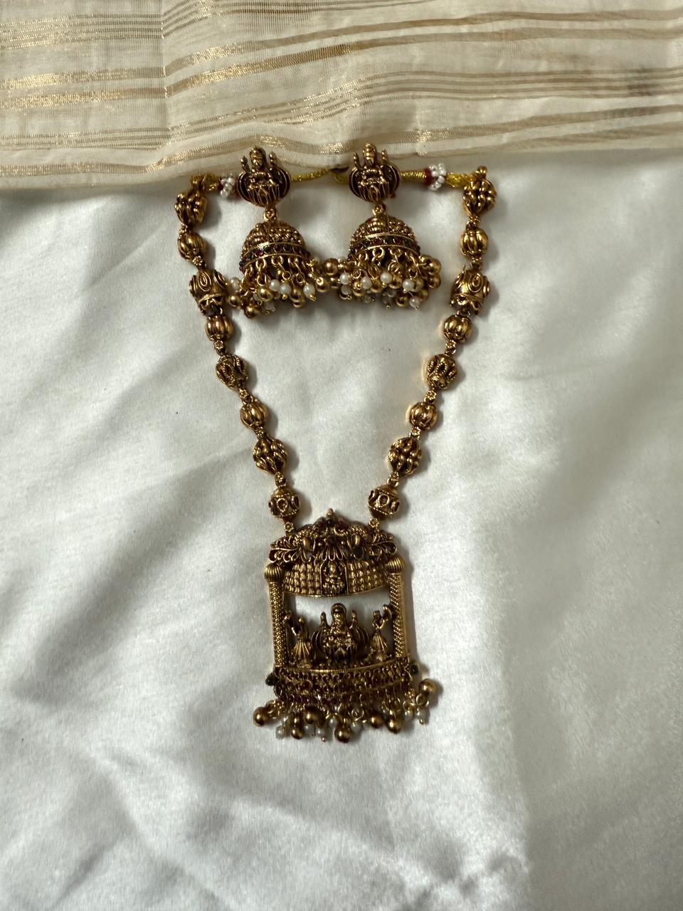 A traditional Lakshmi pendant necklace featuring Goddess Lakshmi, designed to bring divine grace and elegant charm to everyday and festive wear.